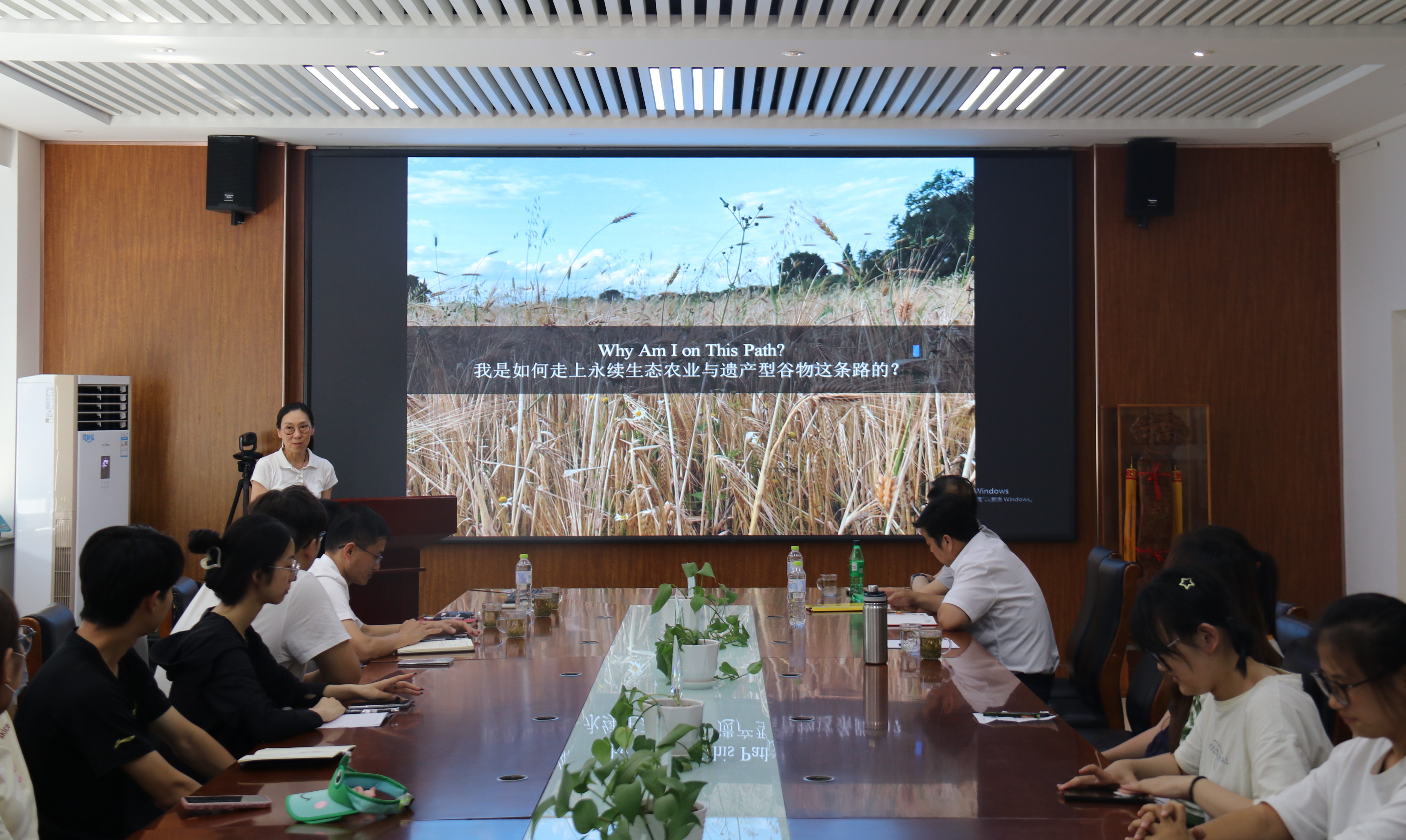 Marina Chang结合自身工作经历,从两个方面对现阶段有关遗产型谷物农业的研究阐述:一是研究种子的来源,特别是1900年之前非现代育种所产的种子;二是研究符合农业生态体系的谷物种植方式,重视农田的复原力、恒产性与生物多样性。Marina Chang指出在实践中运用碳封存,能够发挥苜蓿作物的固氮作用以及老机器的新用途,从而实现耕作可持续化。此外,Marina Chang还介绍了中国的遗产型农业发展以及遗产型谷物农业未来与市场结合的前景。在互动交流环节,Marina Chang就如何保护遗产型谷物与参会师生进行了深入交流。